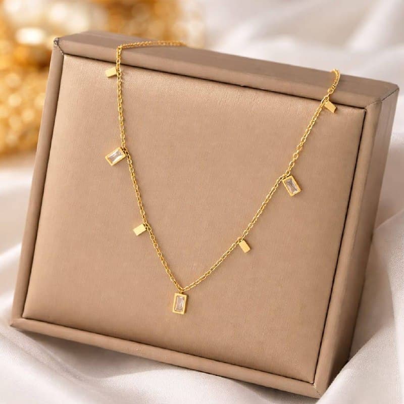 Tiny baguette CZ charms dangling from a delicate cable chain — like little rectangles of light framing your collarbone. Alternating gold squares and crystal drops create a rhythm that catches light differently with every step. The necklace that makes a V-neck look designer.