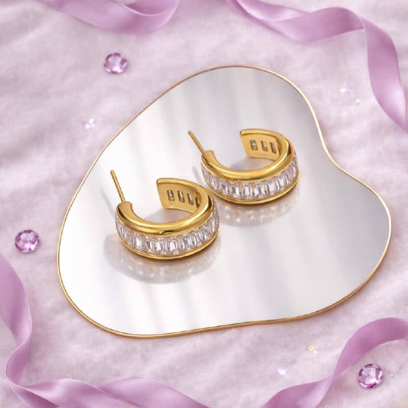 Channel-set rectangular crystals in a sleek C-hoop — Art Deco energy meets 2026 minimalism. These are the earrings you reach for on days you mean business. Each baguette stone is precision-set to catch light in a way that round stones simply can't.