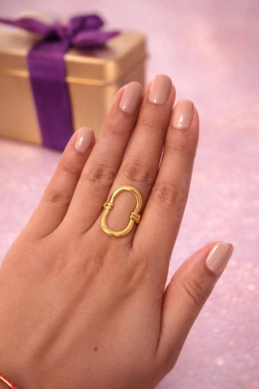 Oversized oval buckle ring with knotted wire-wrap accents at the connection points. Equestrian-luxe energy meets sculptural minimalism — no stones, no engravings, just pure form and mirror-gold sheen. The ring that makes people think you spent way more than ₹399.