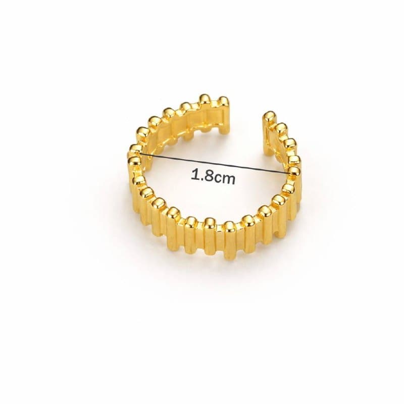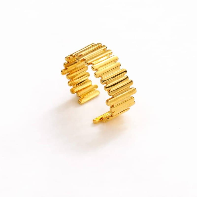 Stacked gold columns that look like a tiny skyline on your finger. Each bar varies in height, creating an architectural rhythm that catches light differently every time you move. Interior bead detailing sits flush against skin for all-day comfort. Bold enough to be a statement, refined enough for everyday.