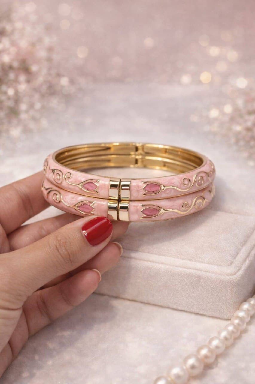 Soft pink tulips and golden swirls on a blush base — romantic without trying. This is the kada you reach for on the morning of a wedding, a pooja, or just a Tuesday when you want to feel like royalty. Openable lock for easy wear.