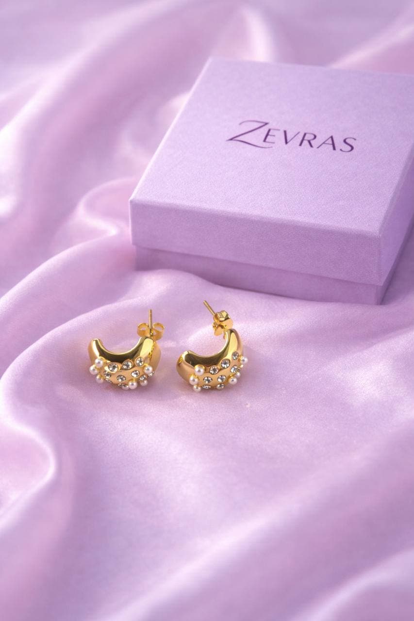 Mini pearls and crystals scattered on a golden crescent — moon energy, ocean vibes, main character aesthetic. These are the most "her" earring we make. The kind that makes people lean in and say "wait, those are gorgeous."