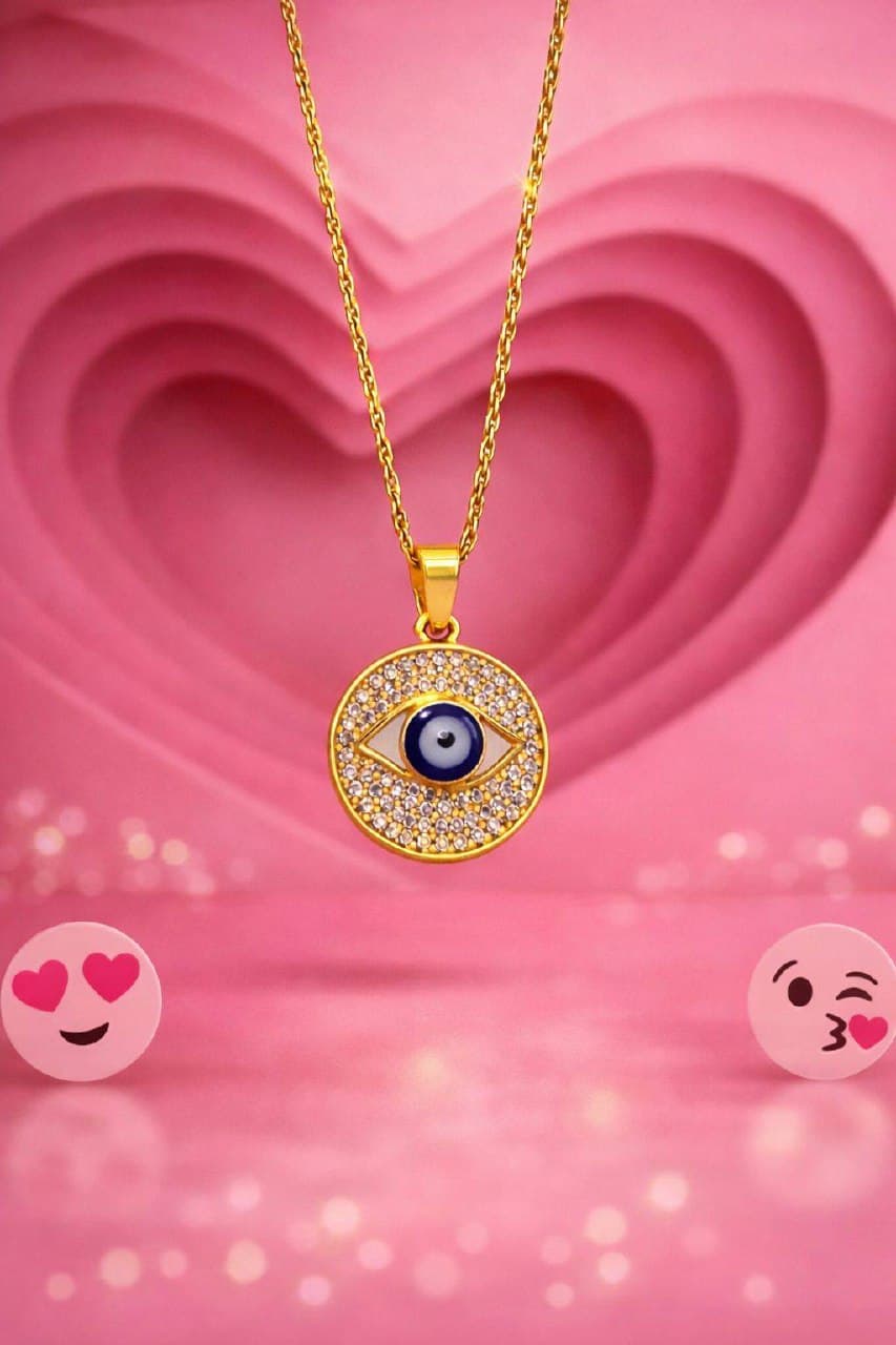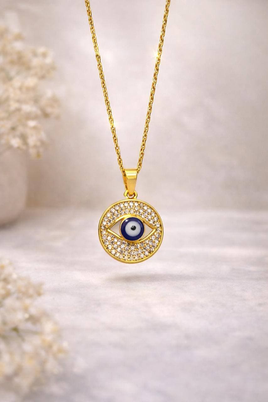 CZ pavé rays burst around a blue enamel evil eye center — protection never looked this gorgeous. The round pendant catches every light in the room. Layer with the Nazar bangle for the full guardian energy.