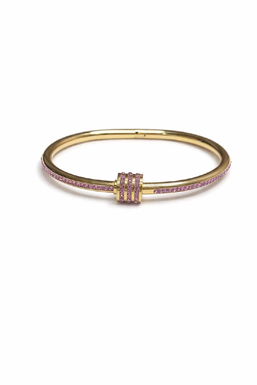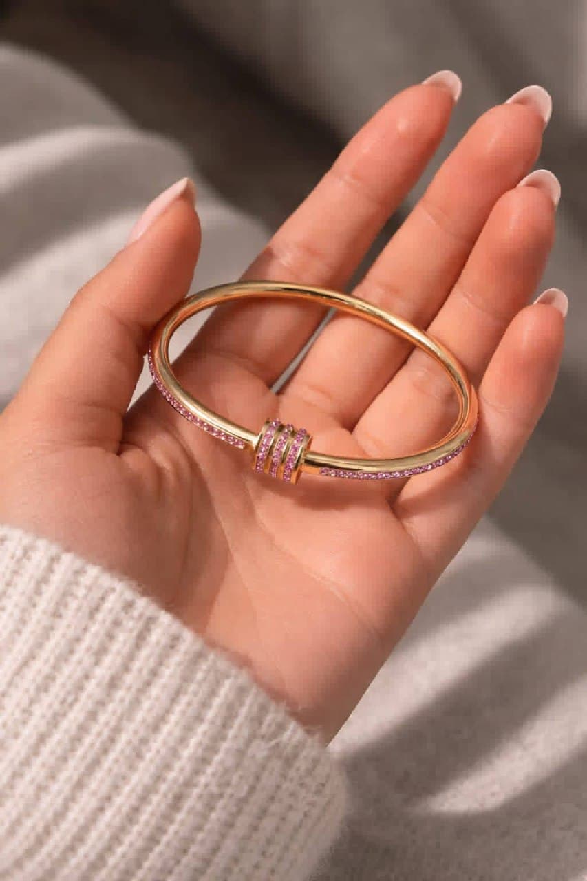 Blush pink CZ stones in barrel links — soft, feminine, and absolutely gorgeous against warm skin tones. Same design DNA as our Émeraude and Crystal bangles. Stack all three for the ultimate color story, or wear solo for everyday romance.